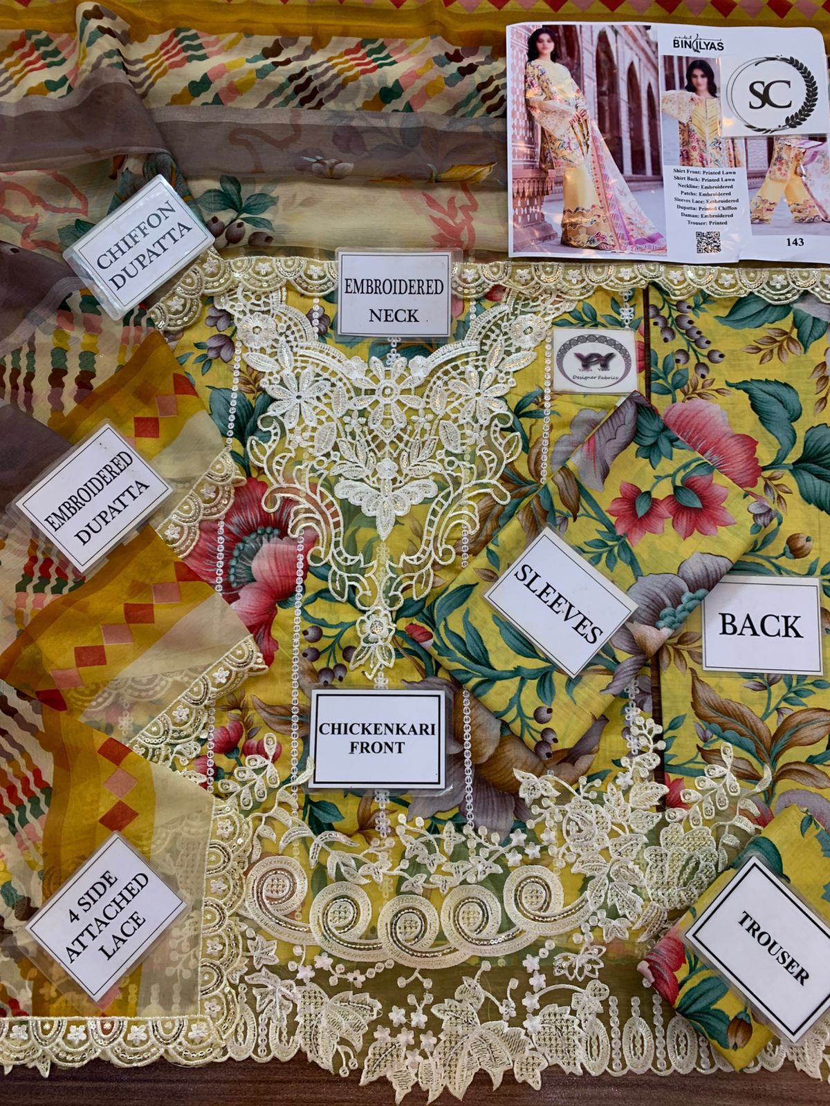 Step into summer elegance with this Bin Ilyas Luxury Lawn 3 Piece Suit, crafted from premium high-quality fabric for a soft and breathable feel. Featuring a beautifully printed chicken kari front with an embroidered neckline and heavy embroidered daman patch, this outfit blends tradition with refined style. Paired with a printed cambric trouser and a crinkle chiffon dupatta finished with heavy 4-side embroidered lace, it’s the perfect choice for festive gatherings and graceful everyday wear—now available at OneWindowCollection.