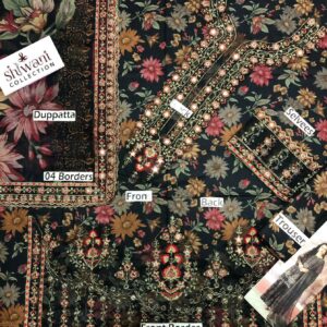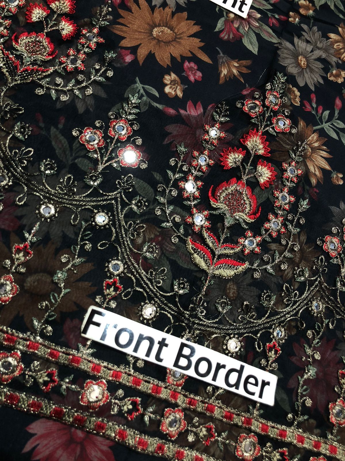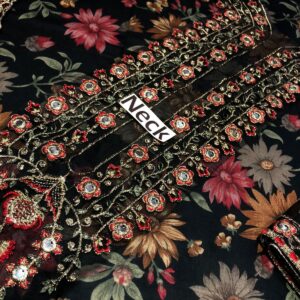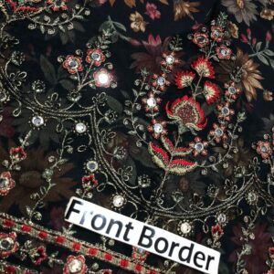 The shirt features a heavy embroidered neck bunch with 9mm sequence work, complemented by embroidered sleeve cuffs and a beautifully detailed front border with chawk bunch and sequence embellishment. The fantastic printed chiffon dupatta is enhanced with heavy embroidery and 4 sides cutwork border, adding a festive and high-end finish.