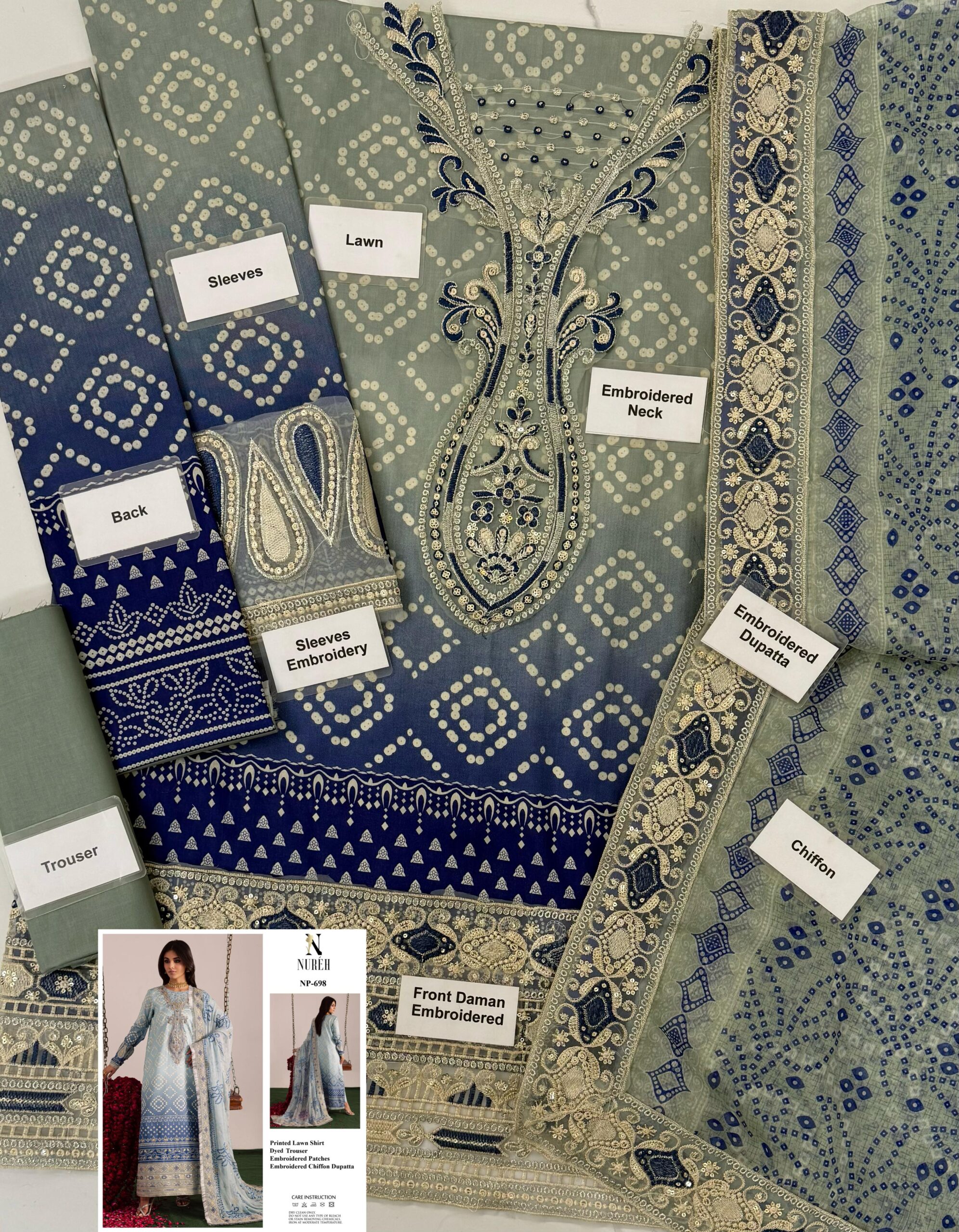 Nureh lawn 3 piece suit is a graceful summer outfit designed for women who love premium Pakistani eastern wear. The printed lawn front, back, and sleeves create a stylish and breathable base, ideal for warm weather. An embroidered neck patch and embroidered sleeve patches add refined detailing, enhancing the overall elegance of the outfit.