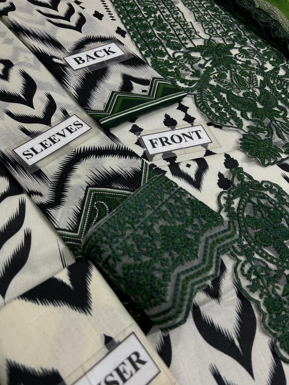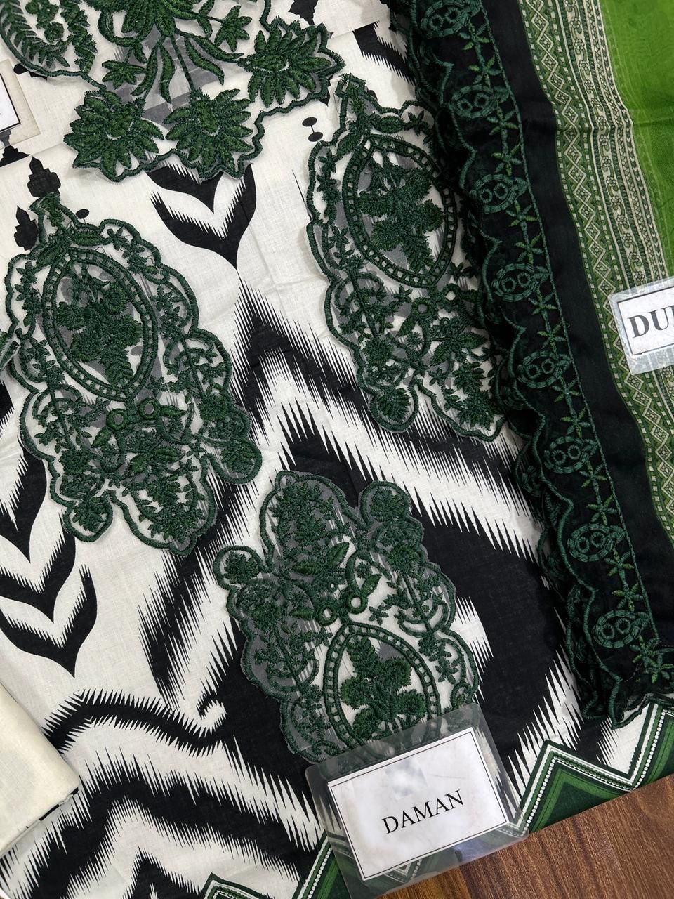 The printed sleeves feature heavy embroidered cuff patches, while the 2-sided chakk embroidered patch adds graceful detailing. Paired with a ready-to-wear printed chiffon dupatta finished with 4-side embroidery and a printed cambric trouser, this outfit offers both comfort and sophistication.
