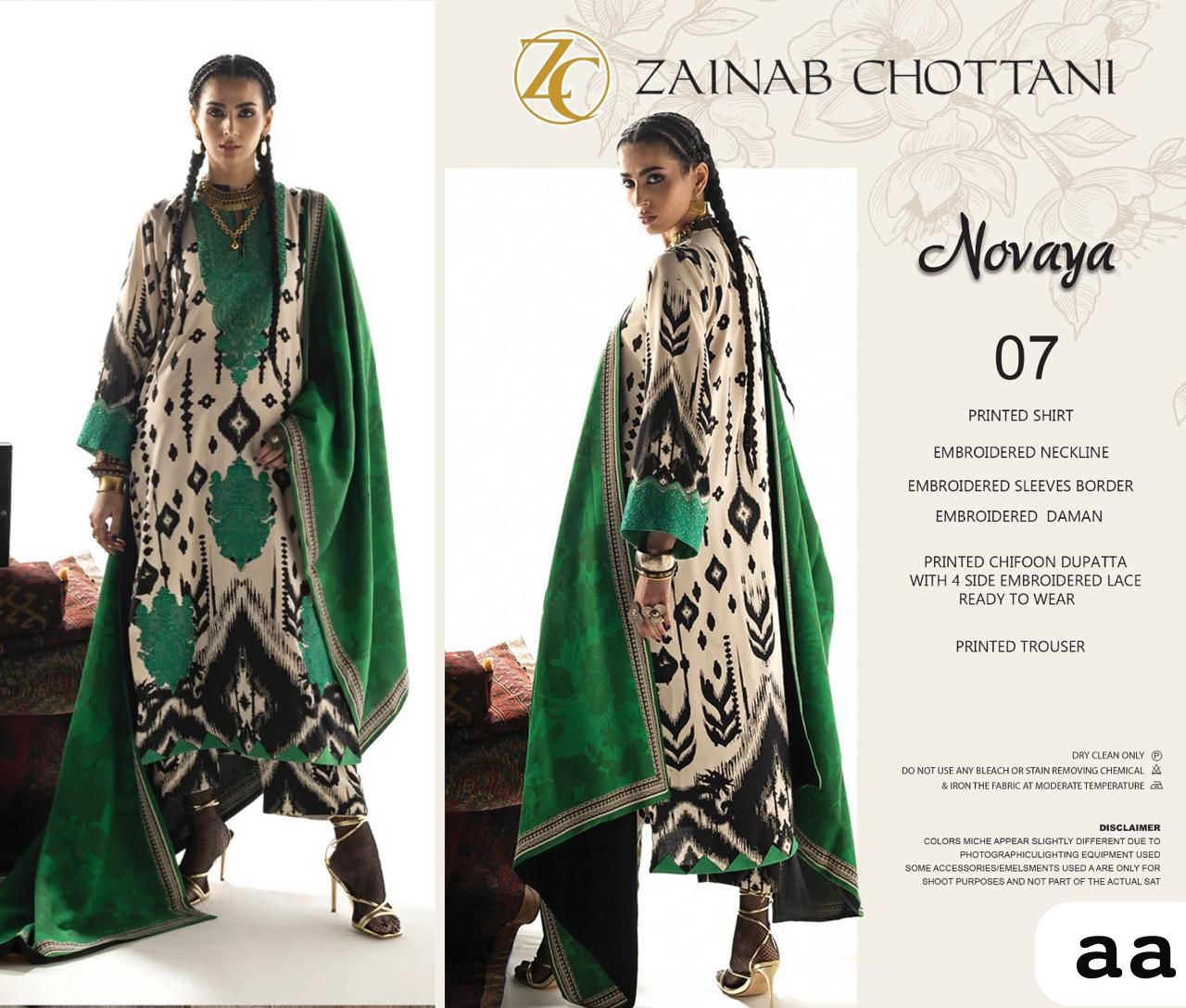 Zainab Chottani Novaya lawn 3 piece suit is a beautifully designed summer outfit crafted for women who appreciate refined eastern fashion. The printed 90/70 lawn front is enhanced with a heavy embroidered neck patch and a delicate front embroidered bunch, adding elegance to the overall look.
